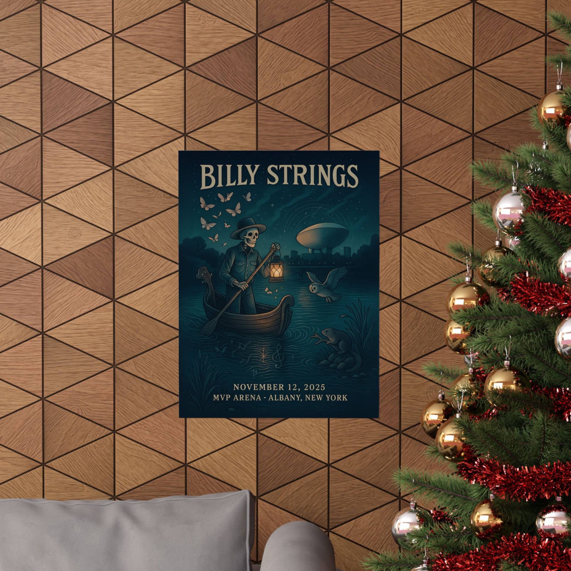 Every detail in "Hudson Night Voyage" tells a story: river reeds along the banks artfully morph into banjo strings, anchored by smooth river stones, paying homage to the band's bluegrass roots. On the distant horizon, Albany's iconic "The Egg" is reimagined as a luminous, moon-like vessel, creating an ethereal sense of cosmic wonder. The distant Albany skyline and the vibrant energy of the MVP Arena are woven into this dreamlike narrative through soft, ethereal light rings in the sky, resembling musical halos. Discover hidden gems like the meticulously rendered beaver on the shoreline, whose chewed branch, through clever negative space, reveals the distinct scroll of a guitar headstock – a unique artistic nod to both the location and the music.