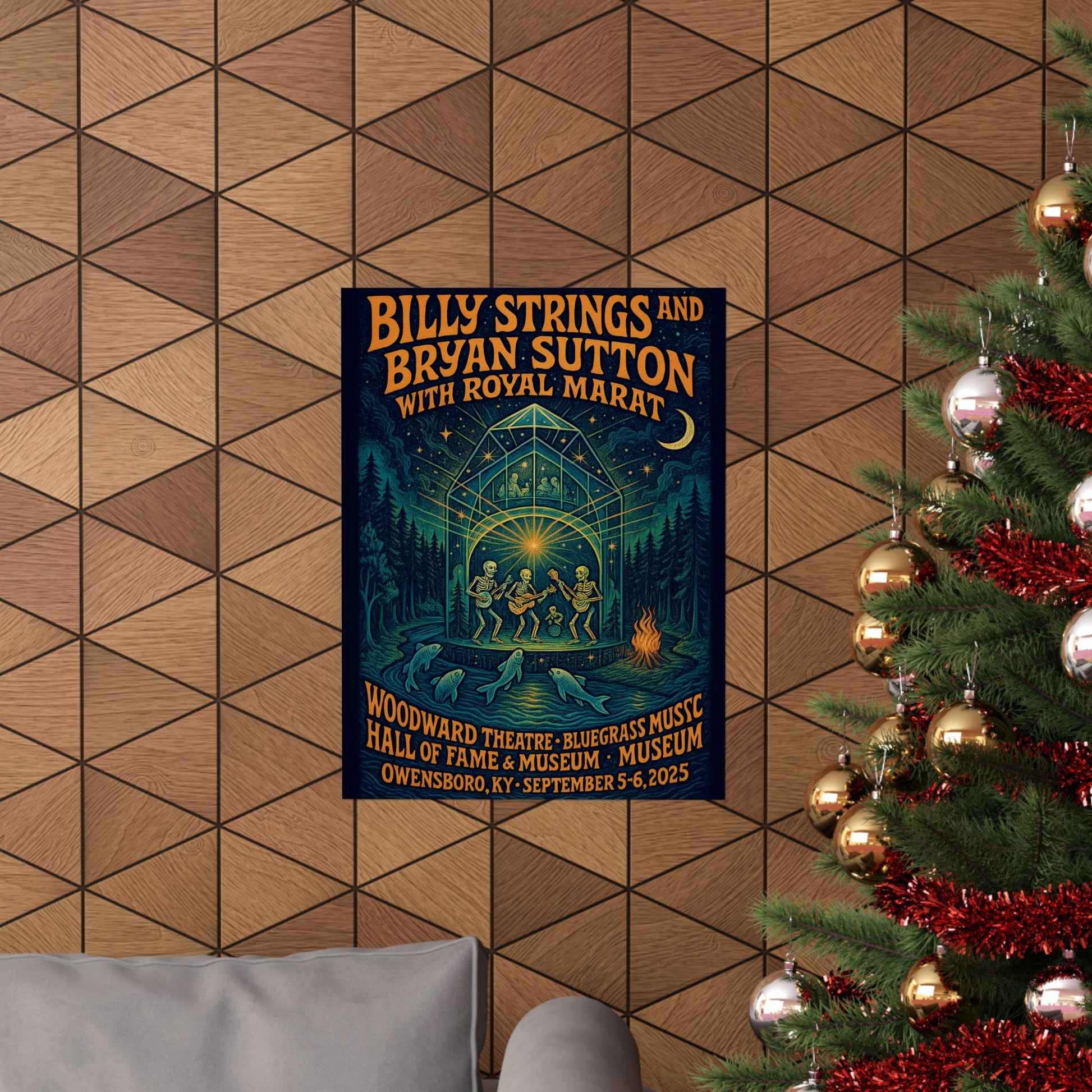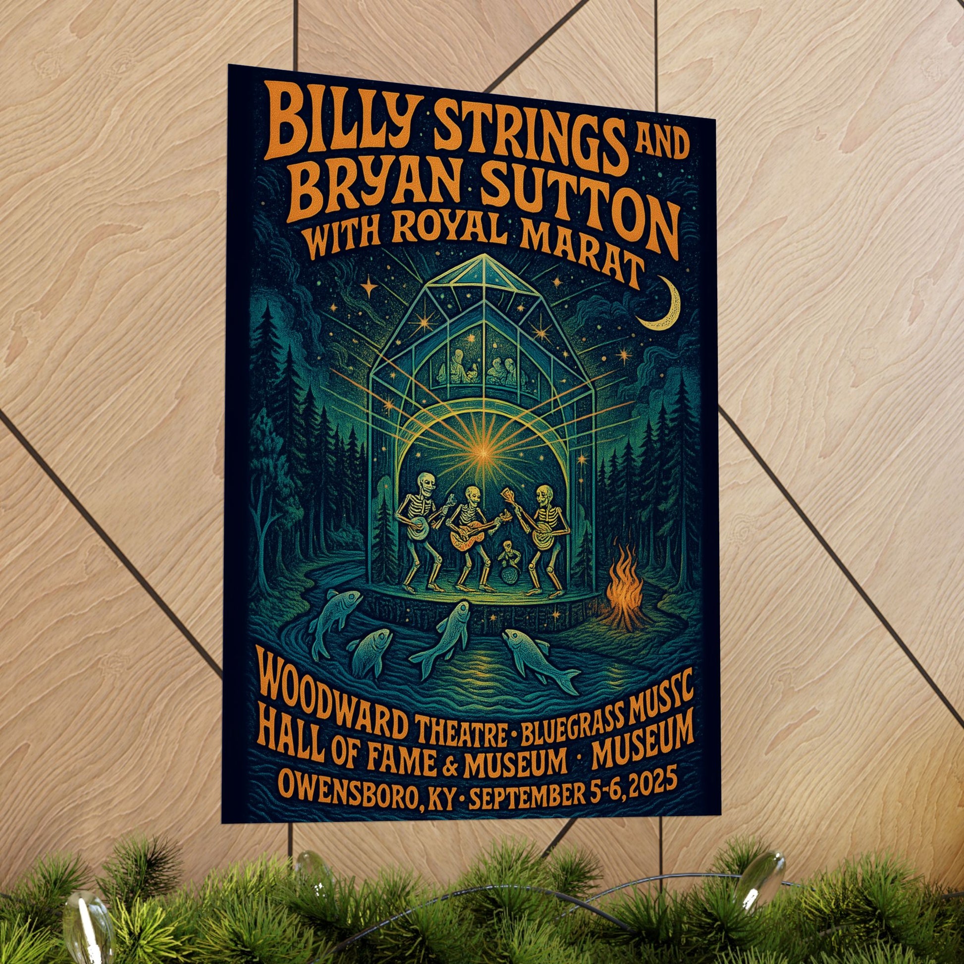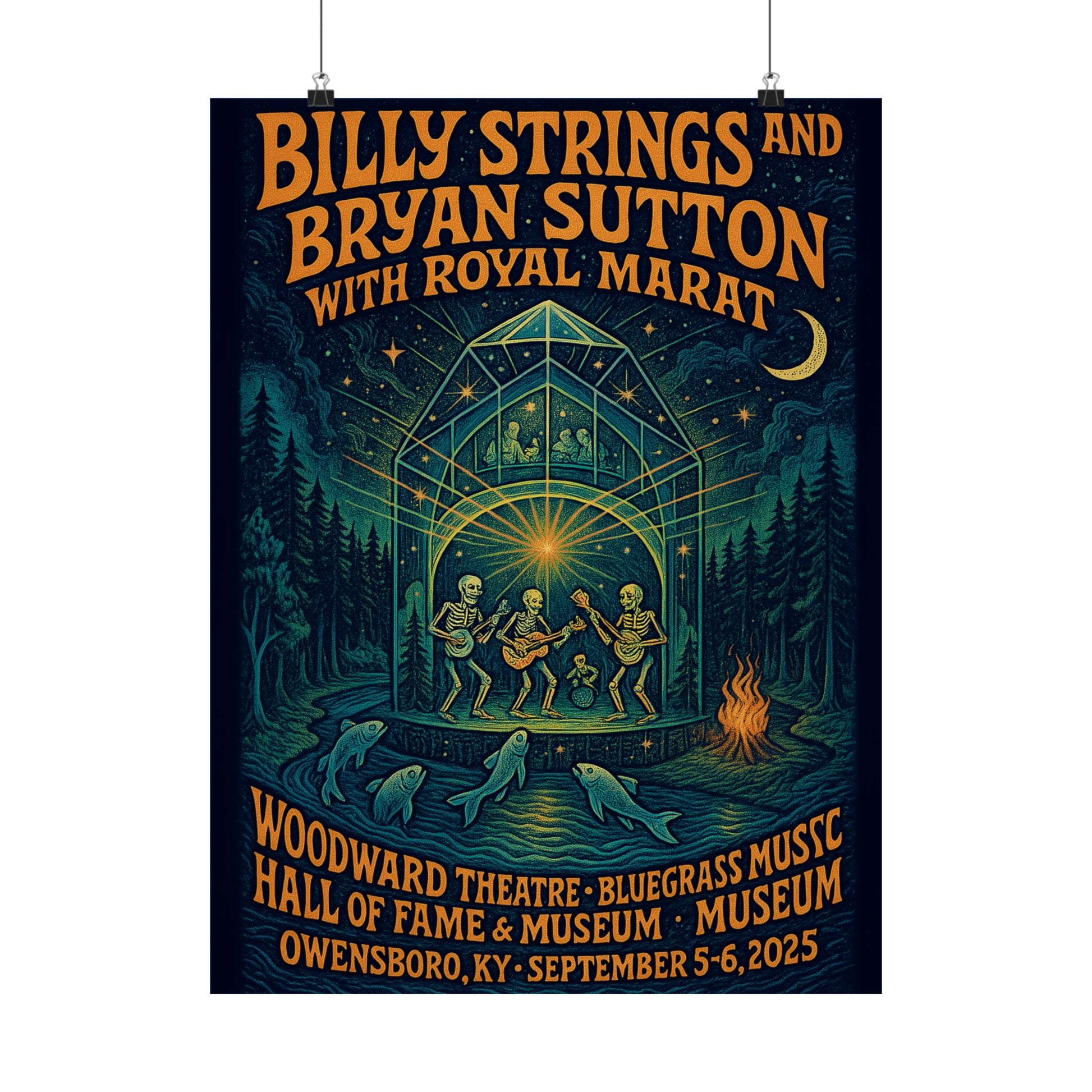 This fan-made concert print salutes Billy Strings & Bryan Sutton with Royal Marat and their 2025 Owensboro run—transforming the Woodward Theatre and the Bluegrass Music Hall of Fame & Museum into a glowing, crystal-stage portal. Inside, a skeleton string band kicks up dust and stardust, radiating mandala beams while the Ohio River hums below and spectral fish leap like notes breaking the surface.