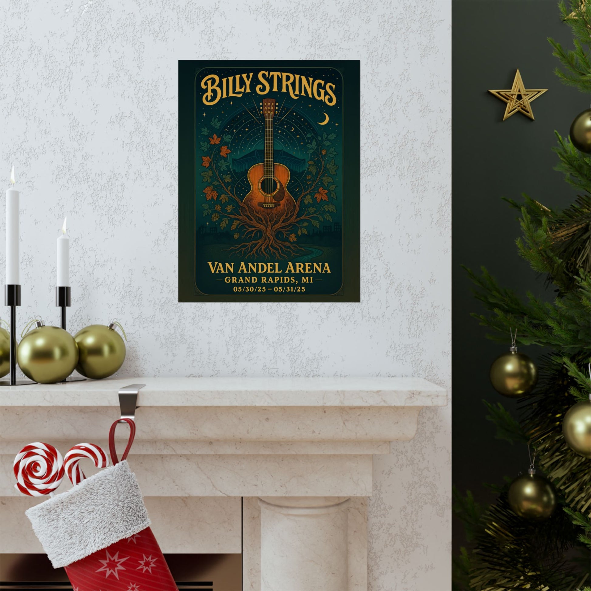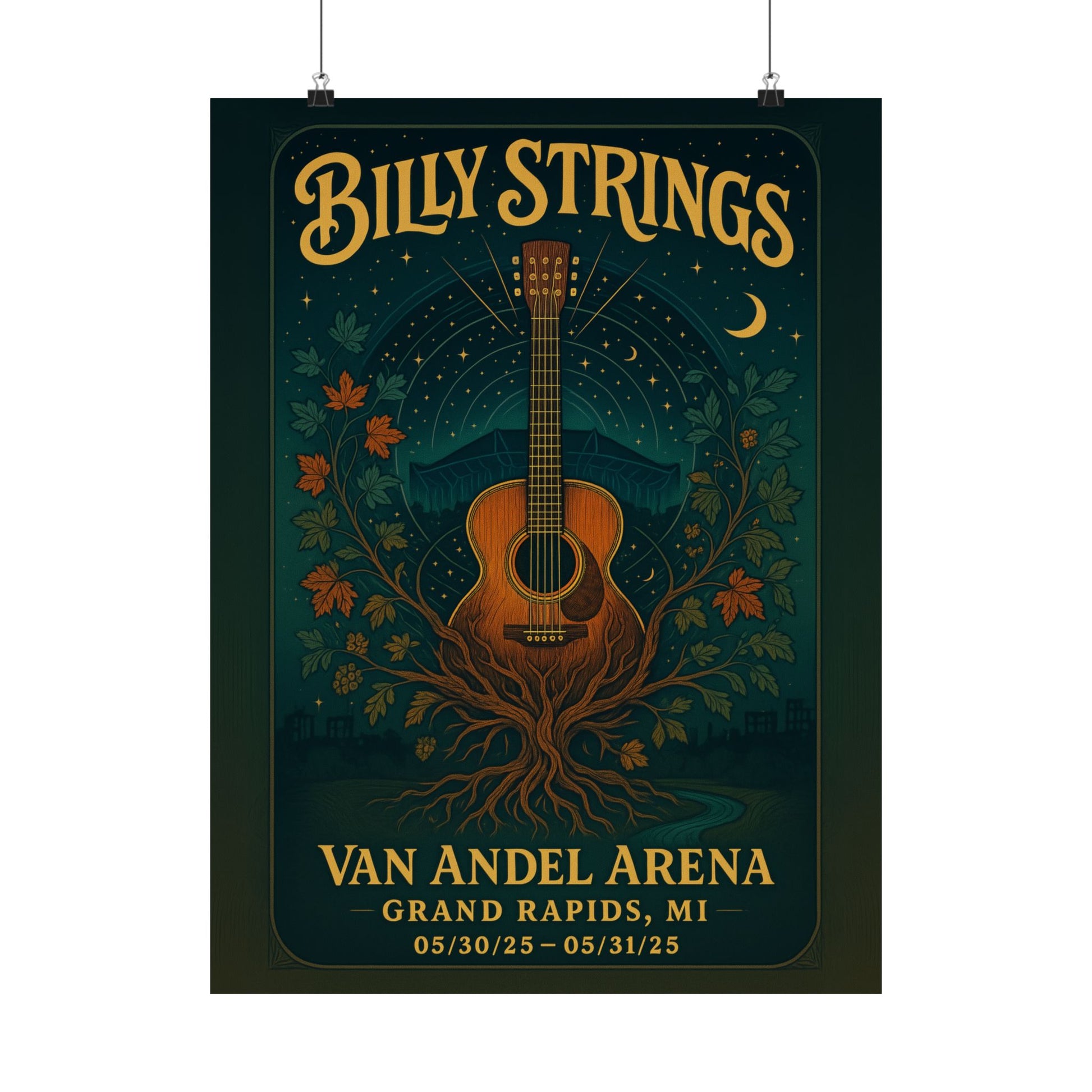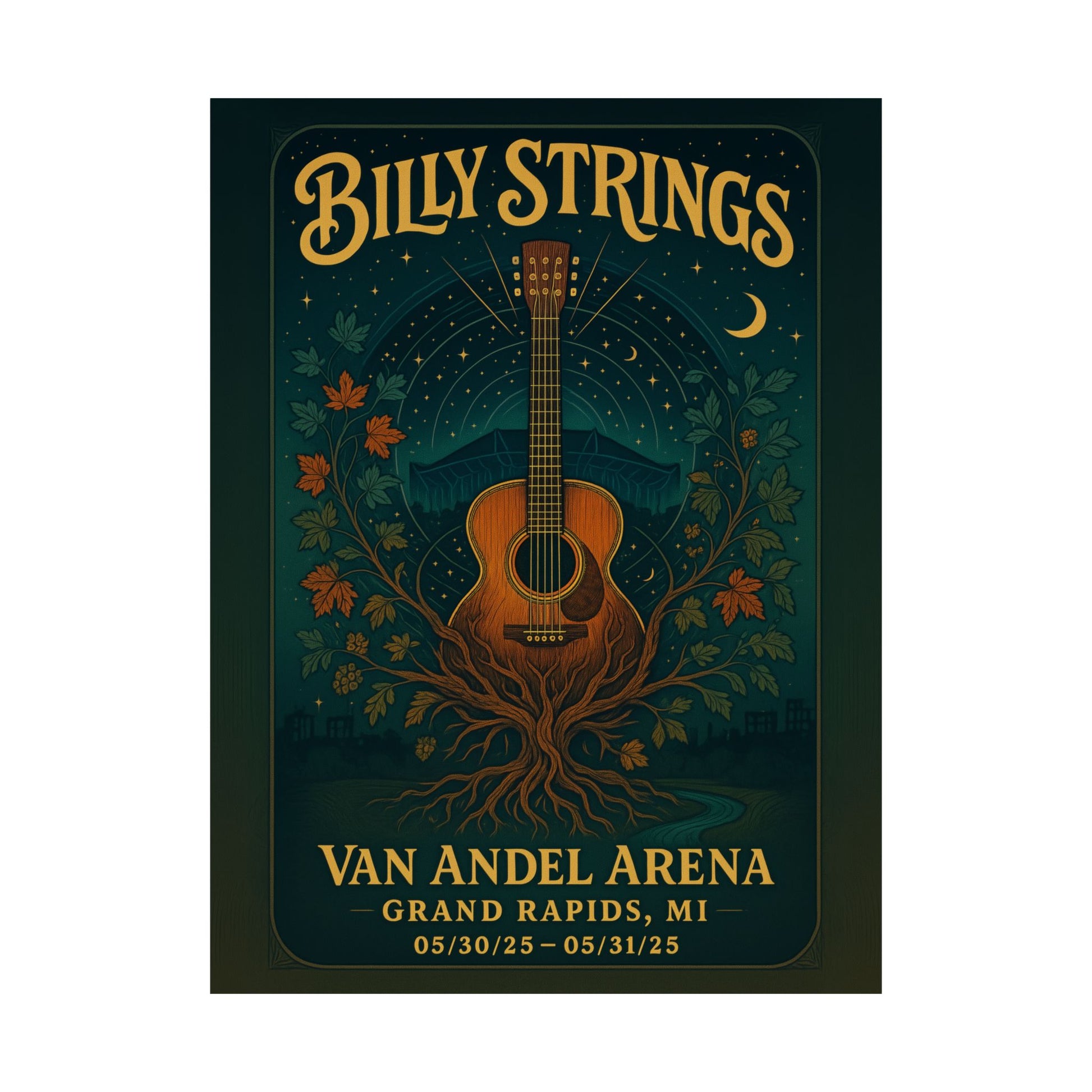 Subtly woven into this cosmic fabric, the distinctive sloped roofline of Van Andel Arena rises, silhouetted against the starry expanse, a grand structure transformed by the night into an organic part of the landscape. Below, the Grand River flows, a tranquil ribbon reflecting the deep indigo and teal of the night, flanked by autumnal Michigan maples and delicate hops vines – a quiet nod to Grand Rapids' own natural beauty and brewing legacy. These elements, from the city's skyline tucked into the lower border to the arena's glass reflections hinted in pale aqua, are integrated with a delicate linocut style and halftone stippling, giving the whole piece a rich, textured depth. The hand-drawn, vintage-psychedelic lettering for 'Billy Strings' crowns the artwork in gleaming gold, a perfect counterpoint to the classic serif of the venue details and dates: 05/30/25 - 05/31/25.