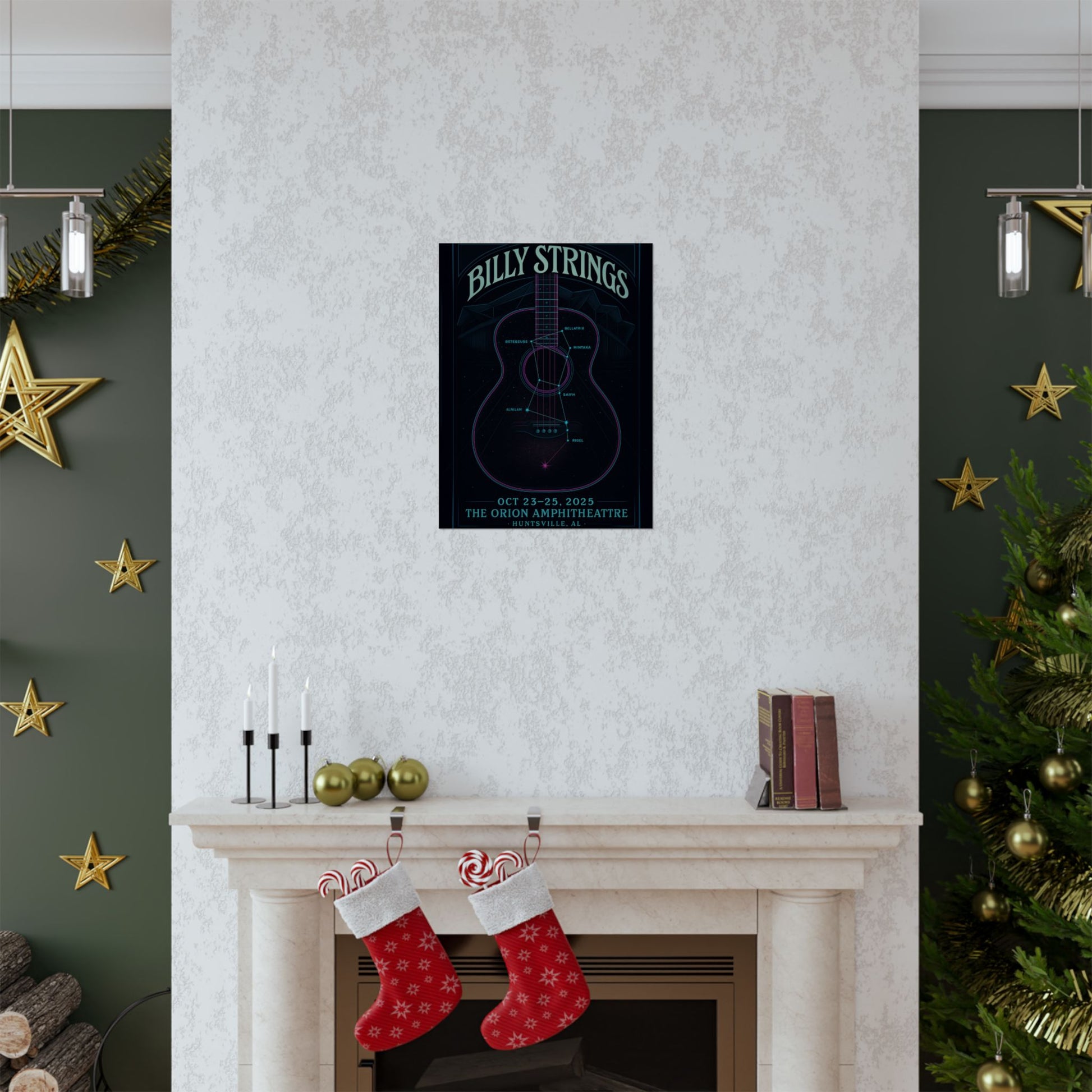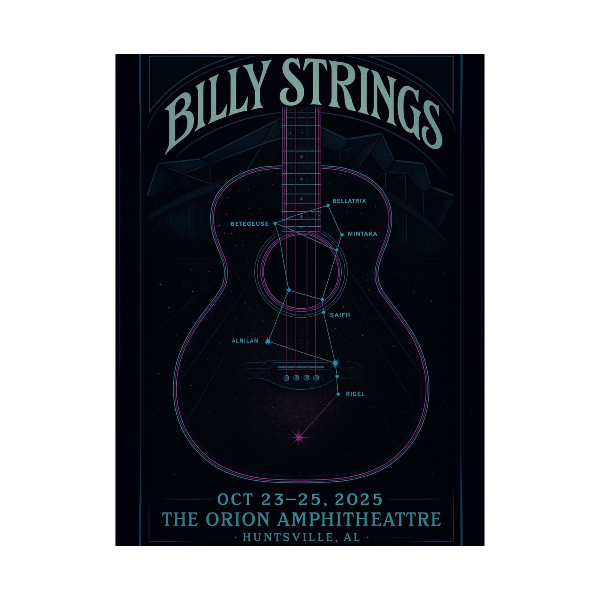 Journey into a mesmerizing blend of music and cosmos with our "Orbital String Lattice" art print, a captivating tribute to Billy Strings' epic performances at The Orion Amphitheatre in Huntsville, AL, October 23-25, 2025. This exquisite fan art transcends the ordinary concert poster, transforming the familiar form of a guitar into a celestial blueprint, where its glowing strings meticulously chart the major stars of the Orion constellation: Betelgeuse, Rigel, Bellatrix, Alnilam, Mintaka, and Saiph.