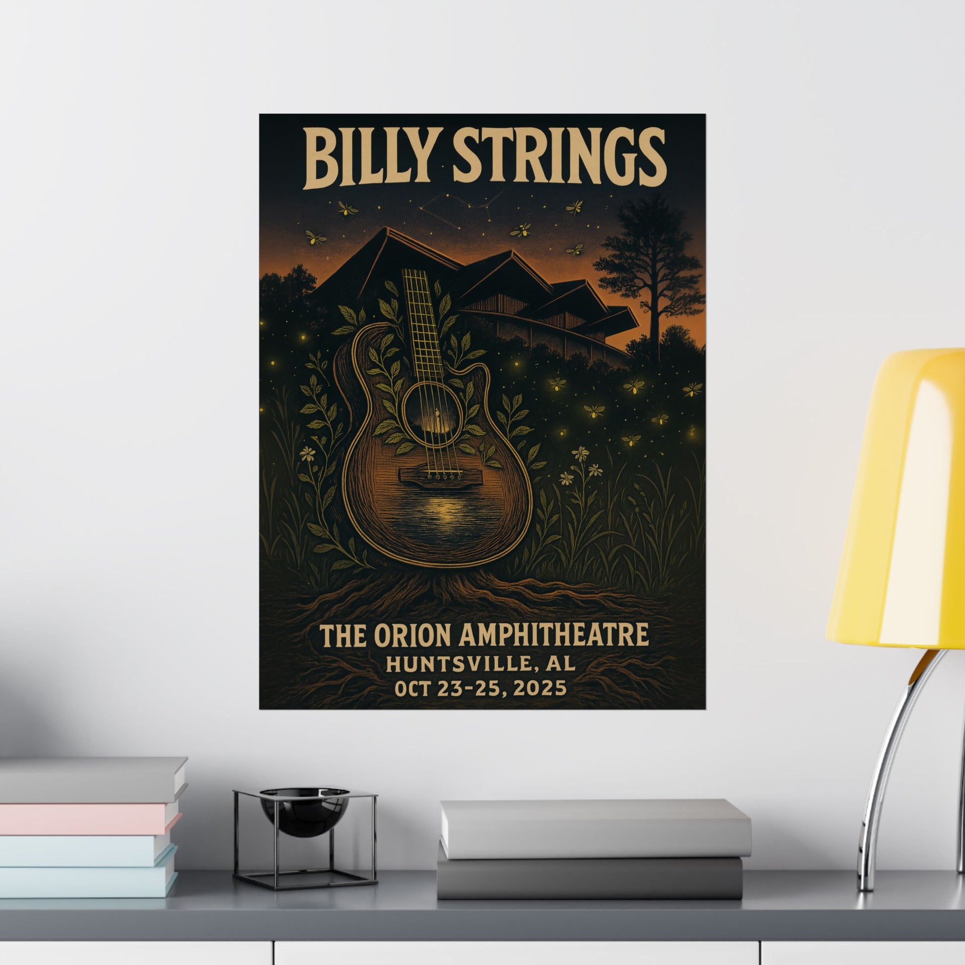 Step into a magical Southern night with this captivating fan art print, celebrating Billy Strings' unforgettable performances at The Orion Amphitheatre in Huntsville, AL, from October 23-25, 2025. This unique design masterfully blends the raw, organic energy of Billy Strings' music with the distinctive character of Huntsville. Experience a scene that feels both deeply rooted in nature and subtly cosmic, transporting you to that intimate twilight moment.