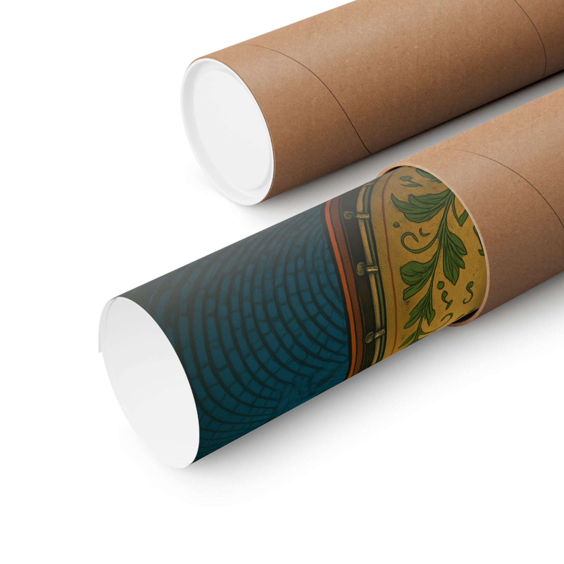 The palette blends rustic warmth – the moss greens and earthy browns of the banjo – with the electric vibrancy of the arena, featuring luminous cobalt and cerulean blues, punctuated by neon amber highlights. It's a fusion, a conversation between the organic and the monumental, inspired by the flowing scripts of Art Nouveau and the vibrant transitions of 1960s psychedelic folk art. This print is a celebration of that communal electricity, a visual melody for the eyes.