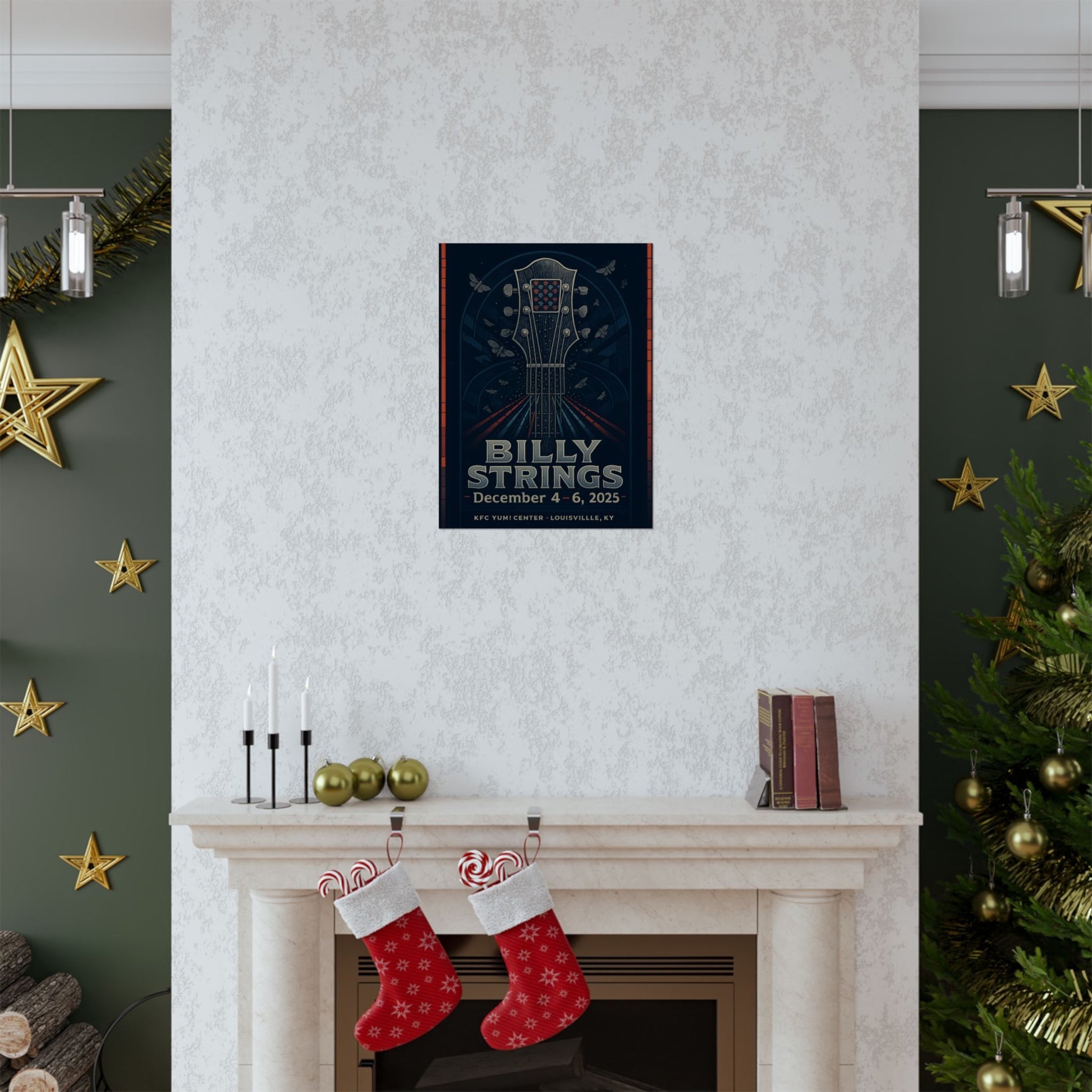Celebrates Billy Strings' three-night residency at the KFC Yum! Center in Louisville, KY, from December 4–6, 2025. Captures the spirit of bluegrass evolution with intricate artistry and the dynamic atmosphere of a live performance. Design features the guitar headstock as a dramatic, illuminated archway, mirroring the Yum! Center's architecture. Vibrant LED-like rays extend from the guitar strings, evoking kinetic light shows and arena views. Moths with wings echoing fretwire textures drift towards luminous paths. A halo of fireflies suggests rapid, intricate picking. Abstract geometry and a rich, deep color palette with disciplined red accents create a visually arresting piece blending modern arena grandeur and mystical natural elements. A must-have for Billy Strings fans and a collector's item. An exceptional gift for music lovers, concert-goers, and appreciators of unique art inspired by contemporary music culture.
