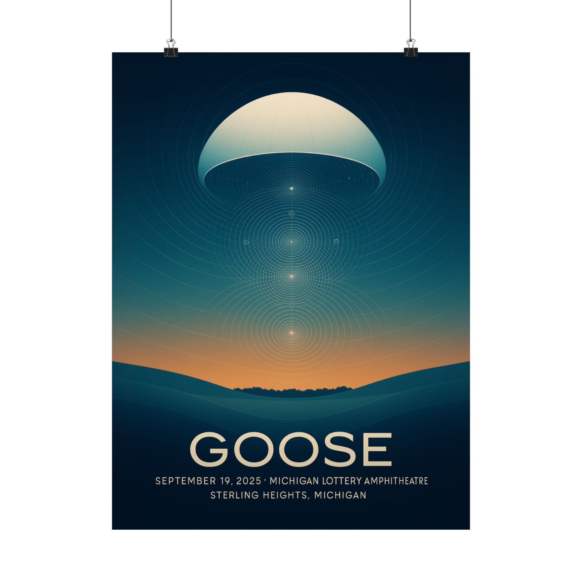 Featuring a mesmerizing interplay of clean concentric arcs and vibrant gradients, this print captures the sensation of sound taking tangible form within the night air. The amphitheatre's iconic tensile canopy transforms into a luminous, stretched membrane, from which sonic energy ripples upward, creating intricate moiré fields and cymatic-style nodal lattices that evoke Goose's signature harmonies and pulsing rhythms. The rolling landscape subtly integrates Great Lakes cues, grounding this abstract vision in its Sterling Heights setting.