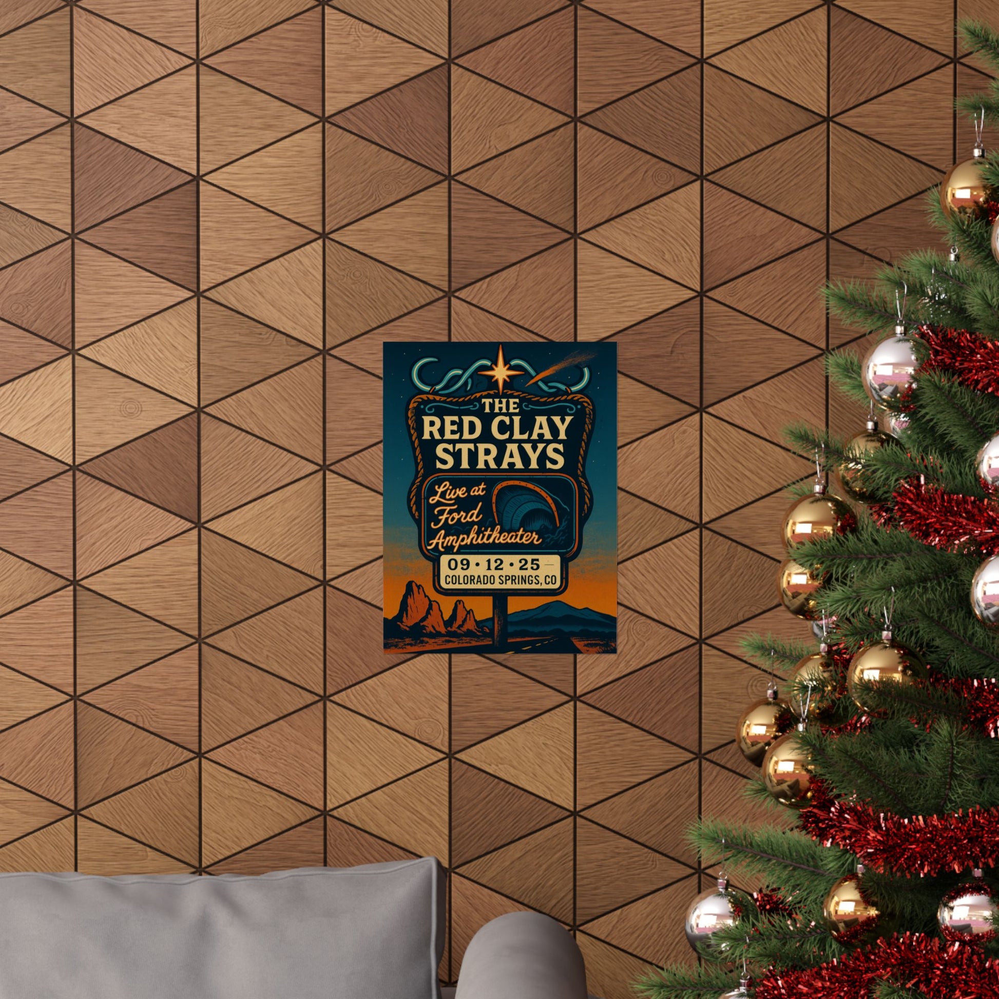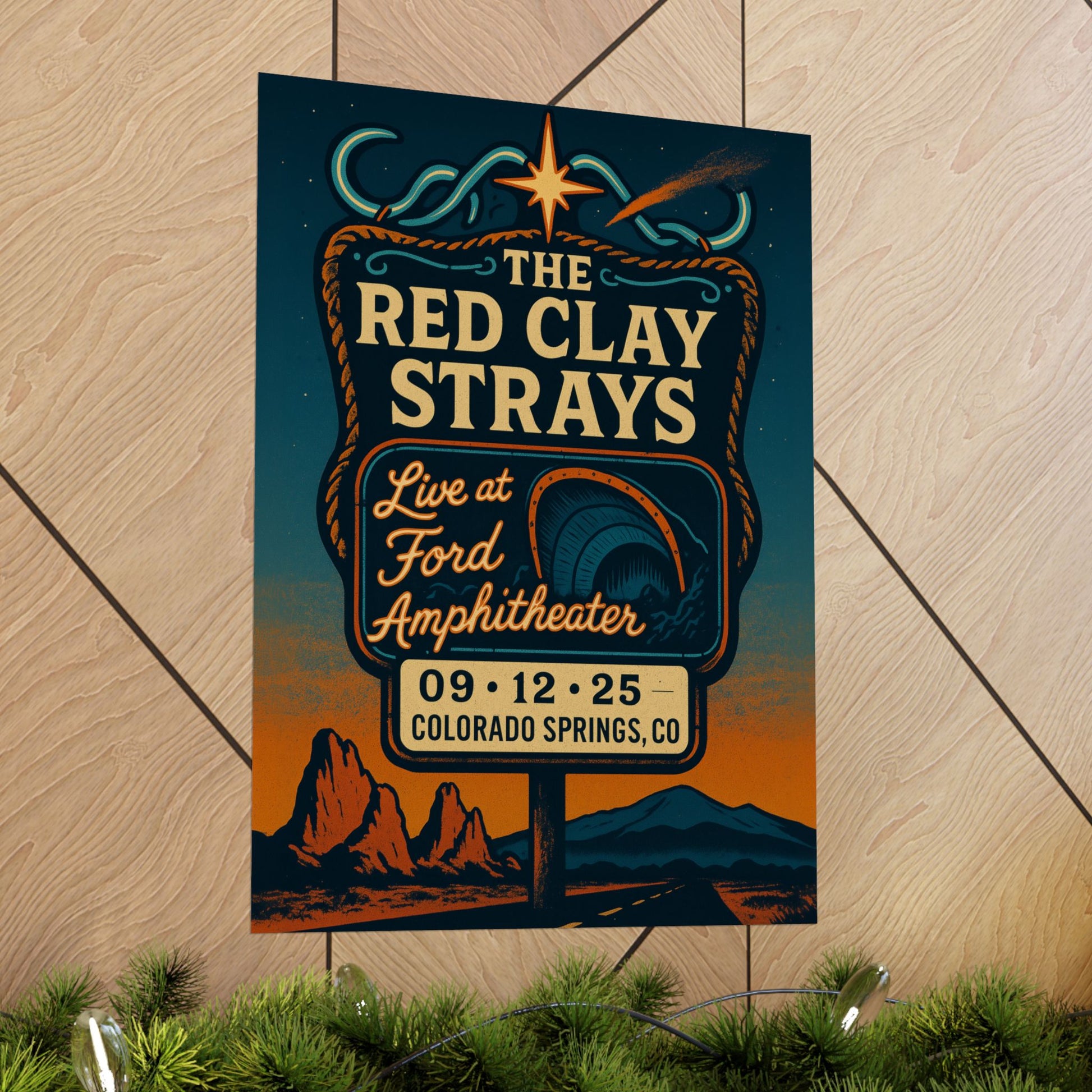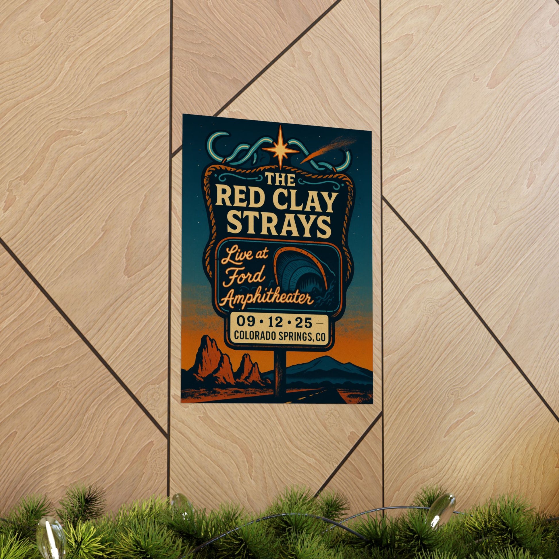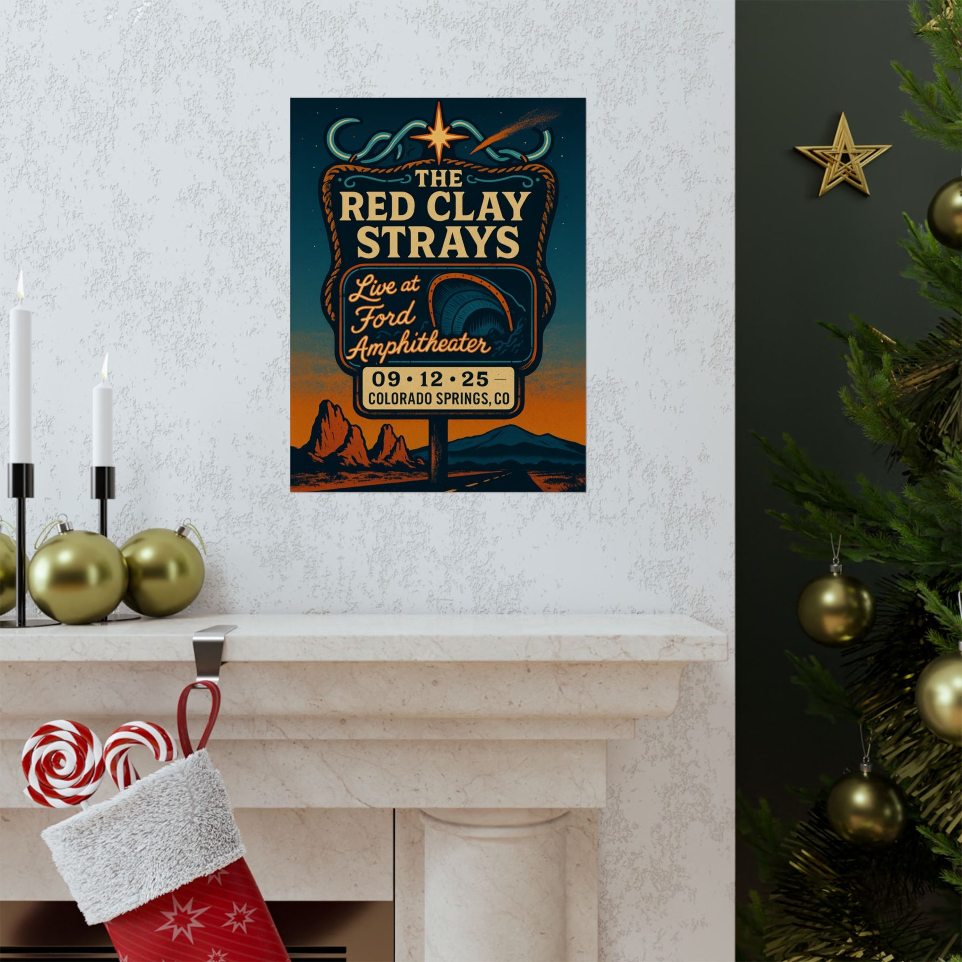 Journey into the heart of mythic Americana with this captivating, fan-made art print, celebrating The Red Clay Strays' unforgettable performance at the Ford Amphitheater in Colorado Springs, CO. Titled "Roadside Shrine to the Range," this unique piece captures the raw essence of outlaw romance and the wanderlust of the open road, blending vintage roadside charm with the electric energy of a live show.