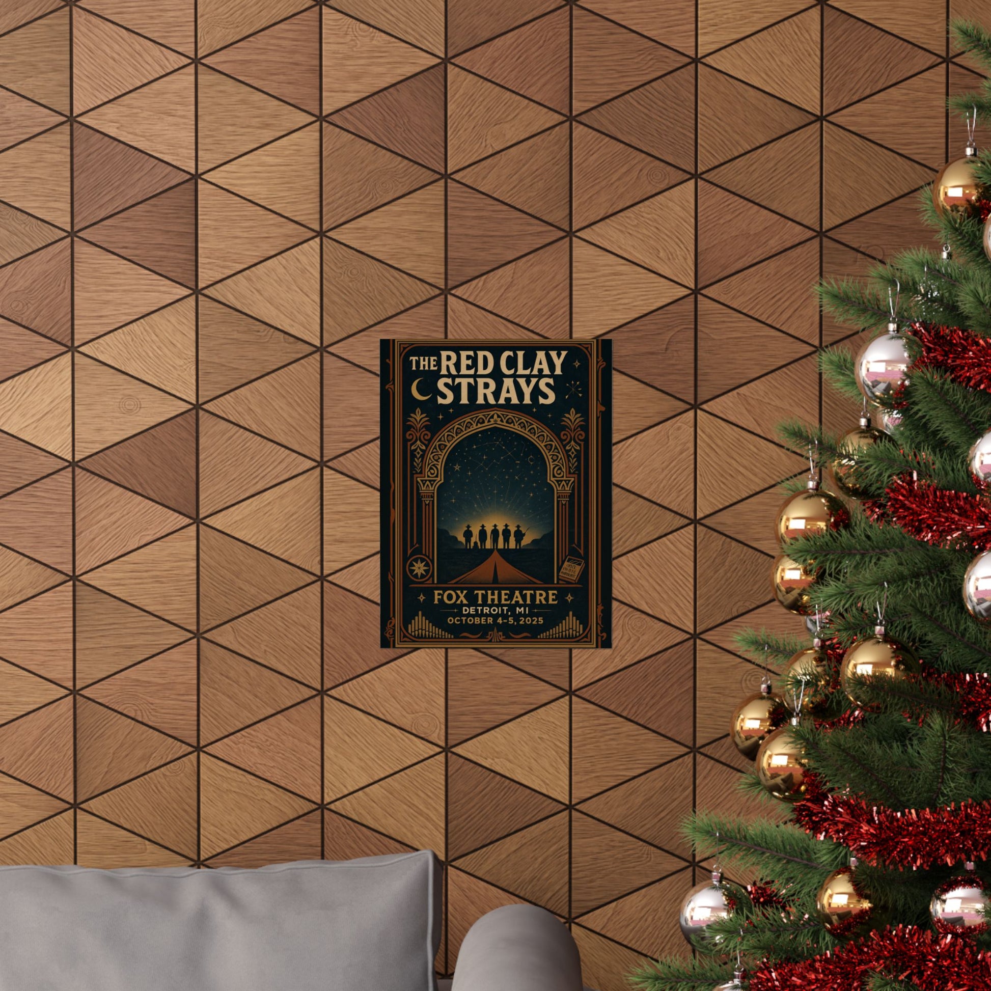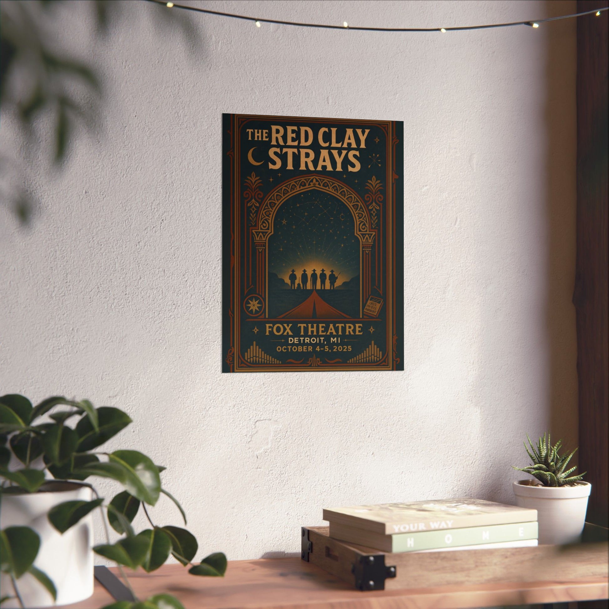 At the heart of this stargazing scene, a lone, tapering road leads upwards, symbolizing The Red Clay Strays' fated journey culminating at this hallowed Detroit stage. Silhouetted against the glowing horizon stand five figures, like timeless tin-type ghosts—their hats and instruments recognizable, yet universally embodying the band's narrative of movement and destiny. The intricate Moorish and Egyptian filigree of the arch is distilled into bold, graphic motifs, lending the print the weight and allure of a treasured relic. Within this ornate border, small desert talismans appear: a crescent moon, an eight-point star coin, and a matchbook emblazoned "Made By These Moments," each a symbolic touchstone from the band's rich lyrical landscape of luck and memory.