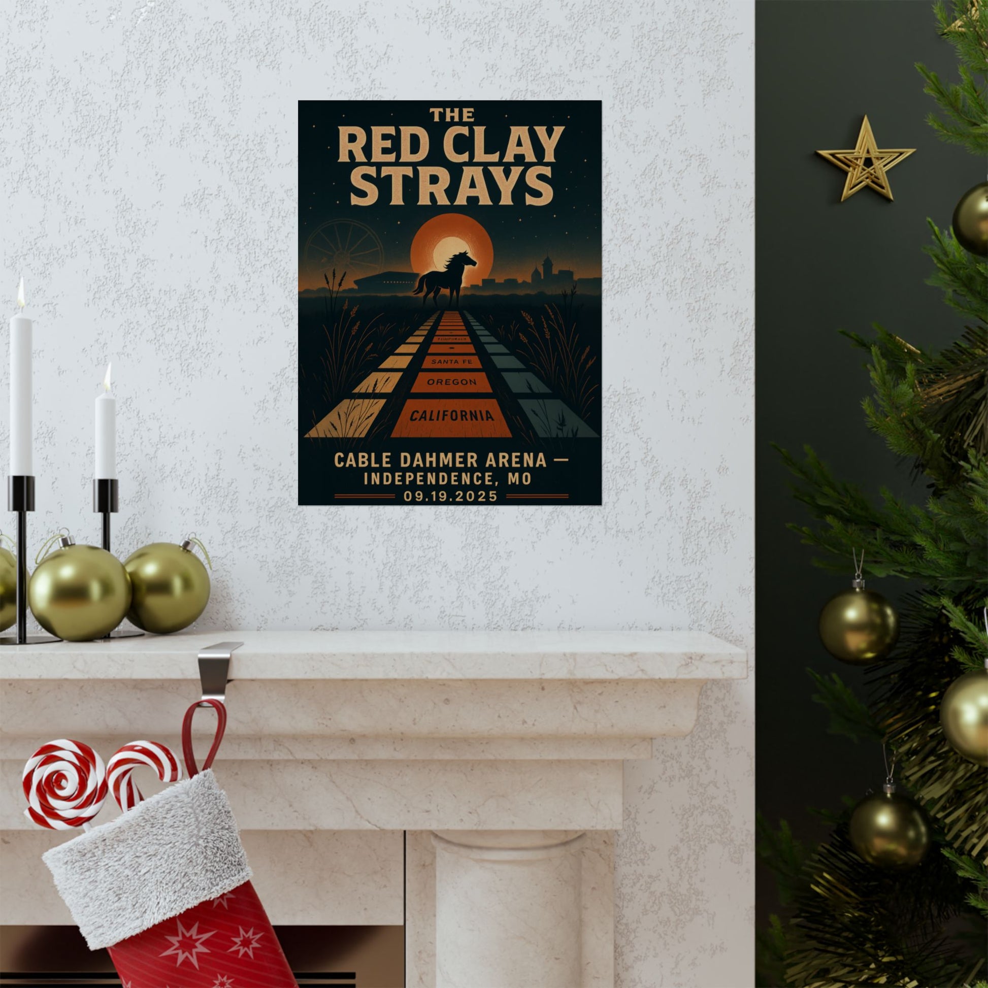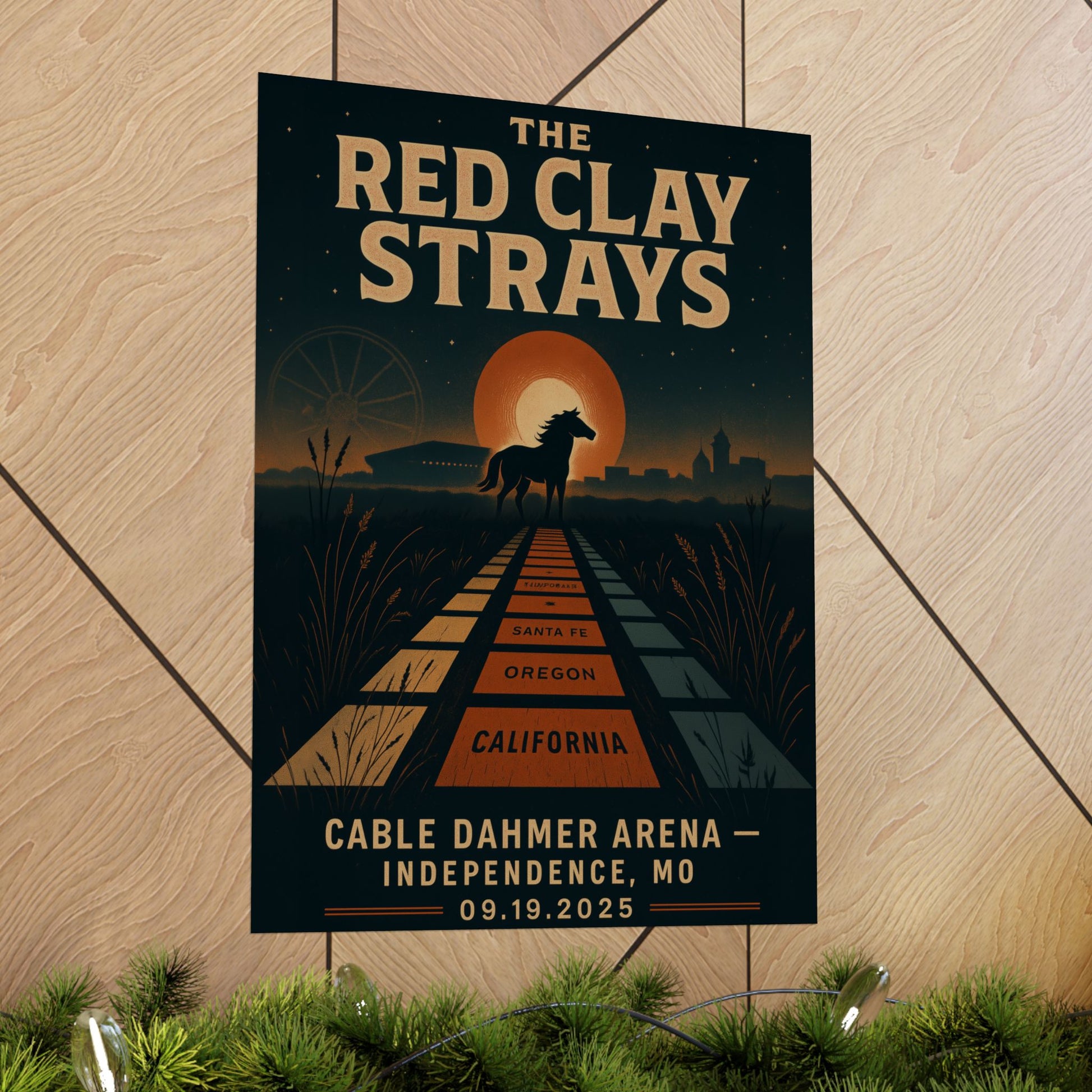 Unleash the spirit of The Red Clay Strays with this extraordinary, fan-crafted concert art print, "TRAILS x LED RUNWAY." This exclusive piece captures the raw, electrifying energy and mythic journey motifs of the band's unforgettable show at the Cable Dahmer Arena in Independence, MO, on September 19, 2025. A true collector's item, this artwork masterfully blends frontier history with the pulsating anticipation of a modern stadium experience.