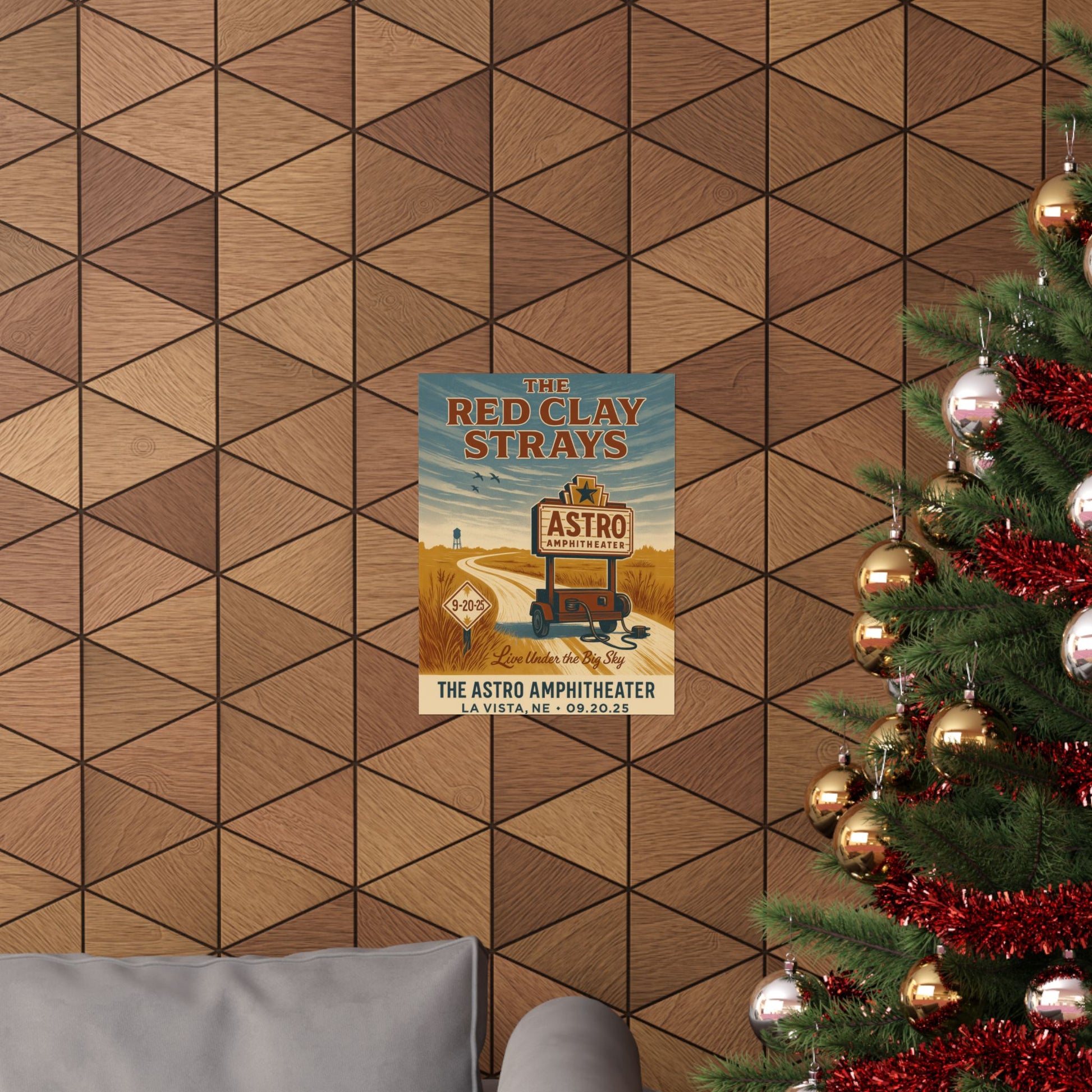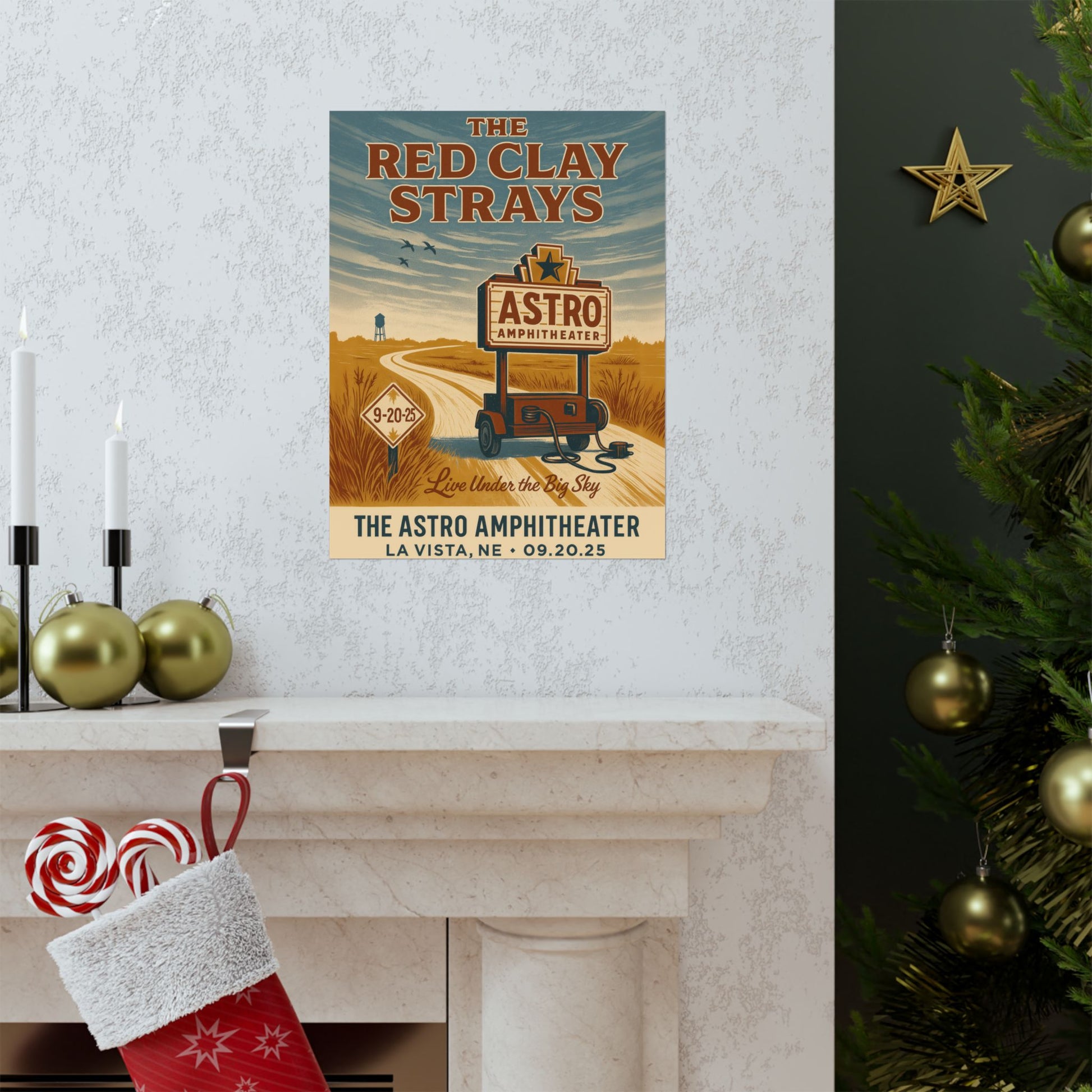 Embark on a visual journey into the heart of Americana with this captivating art print, celebrating The Red Clay Strays' memorable performance at The Astro Amphitheater in La Vista, NE. This exquisite piece masterfully captures the essence of the Great Plains, featuring a winding dirt road that beckons you towards the iconic Astro marquee, glowing under a vast, cinematic twilight sky. A solitary water tower stands as a quiet sentinel in the distance, perfectly mirroring the expansive, open feel of the Nebraska landscape and embodying the band's cherished 'ramblin' spirit.'