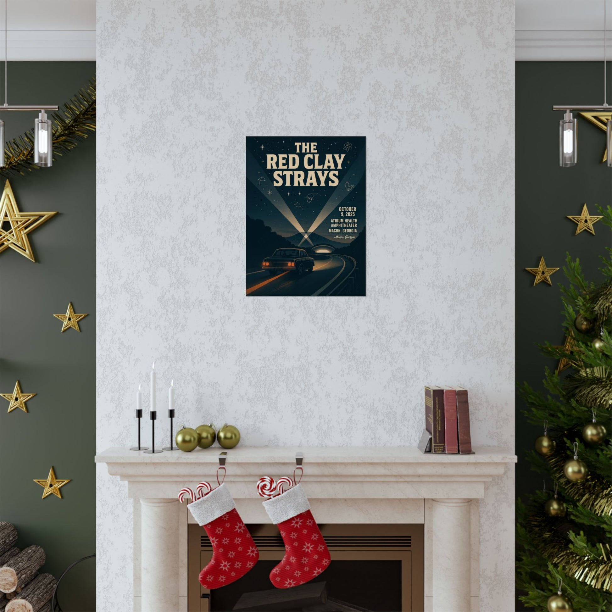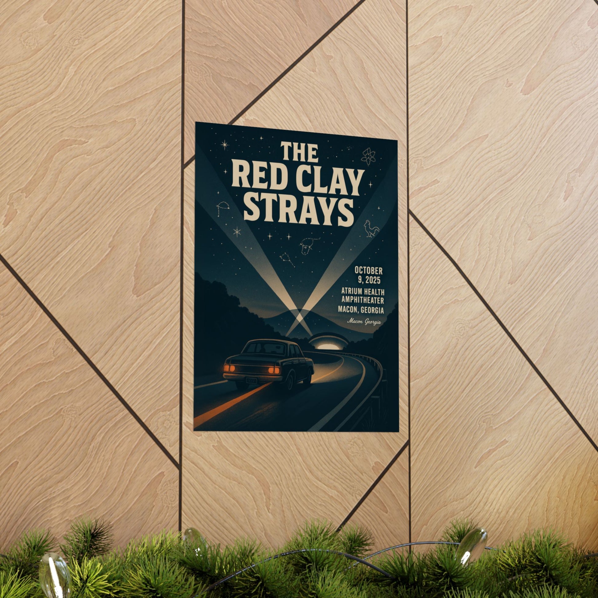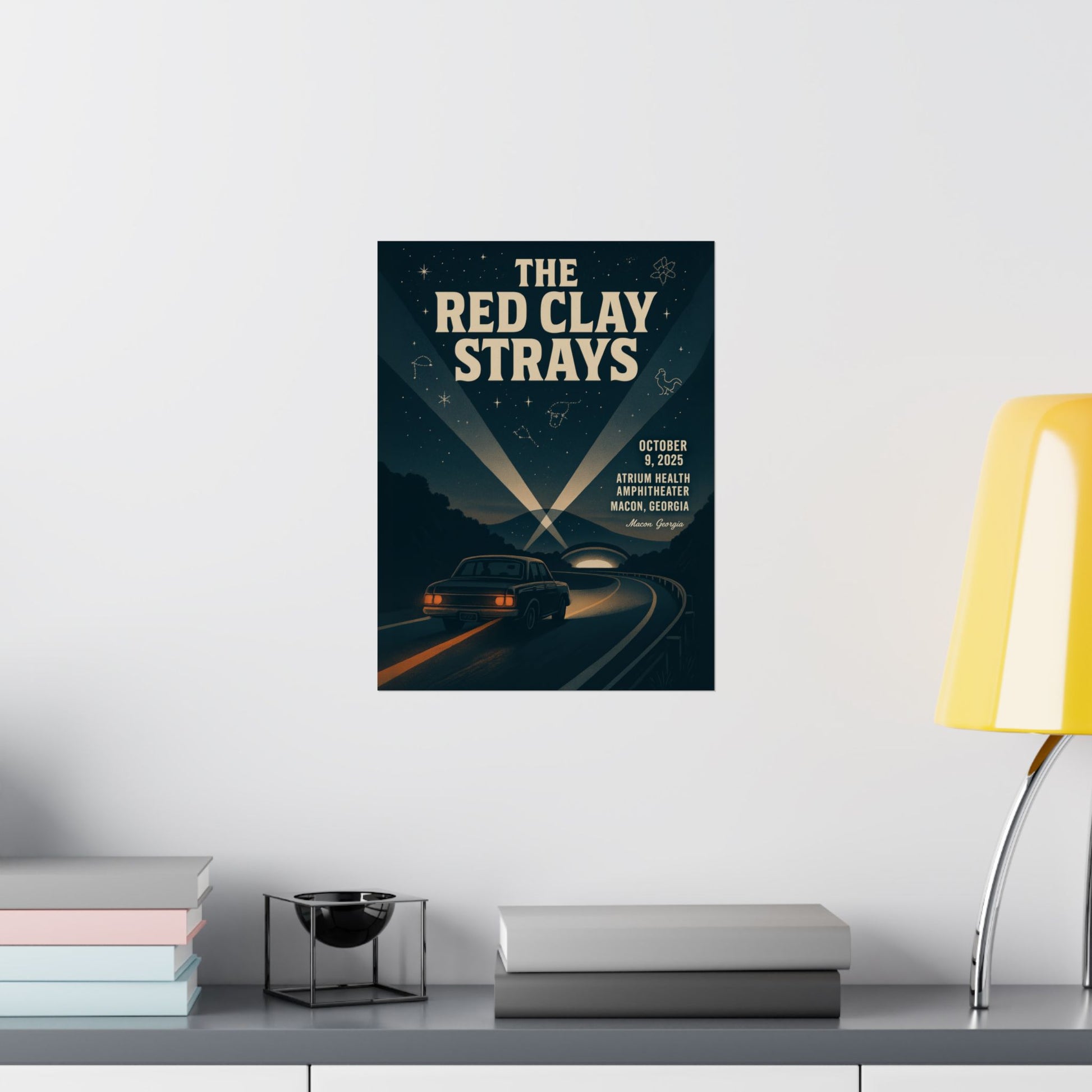 Gaze closer to discover subtle celestial tributes in the night sky: a powerful goat-like figure and a vintage microphone constellation, honoring Macon’s storied musical lineage and legendary Capricorn Studios. This print embodies a timeless mood – where sacred ground meets modern showmanship, creating a quietly epic and communal atmosphere that perfectly echoes the gritty, glowing center stage presence of The Red Clay Strays. It's more than just a poster; it's a piece of art that resonates with history, music, and the spirit of a memorable night.