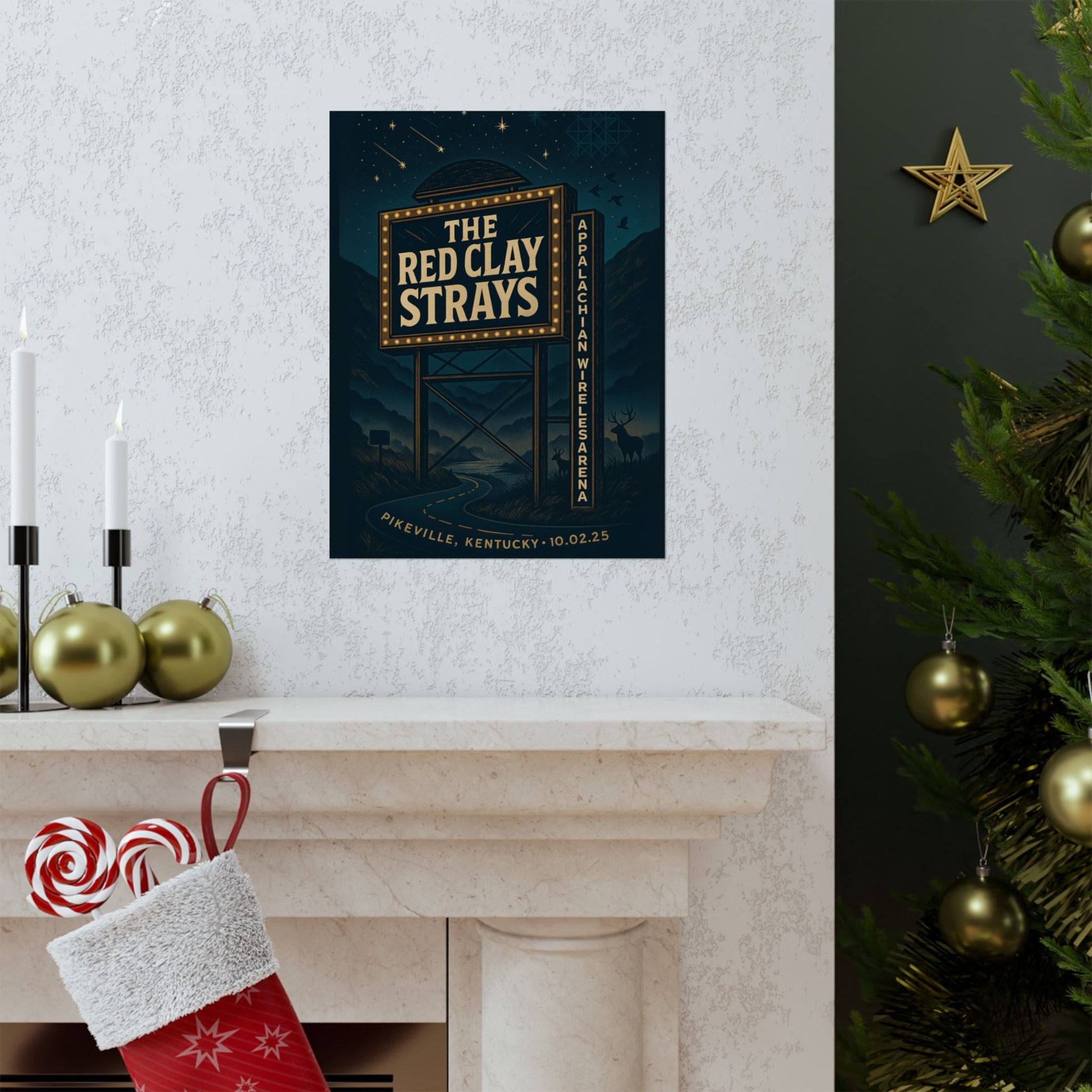 Immerse yourself in the raw, cinematic energy of The Red Clay Strays with this striking "Holler Night Drive" fan art print. This unique piece transports you to the heart of a Kentucky night, featuring an iconic roadside billboard for the Appalachian Wireless Arena, transformed into a luminous beacon under a starlit, speckled sky. It captures the very essence of an outlaw country ballad, painting a captivating scene with a winding, starlit road, silhouetted elk, and subtle nods to classic Appalachian craft and folklore.