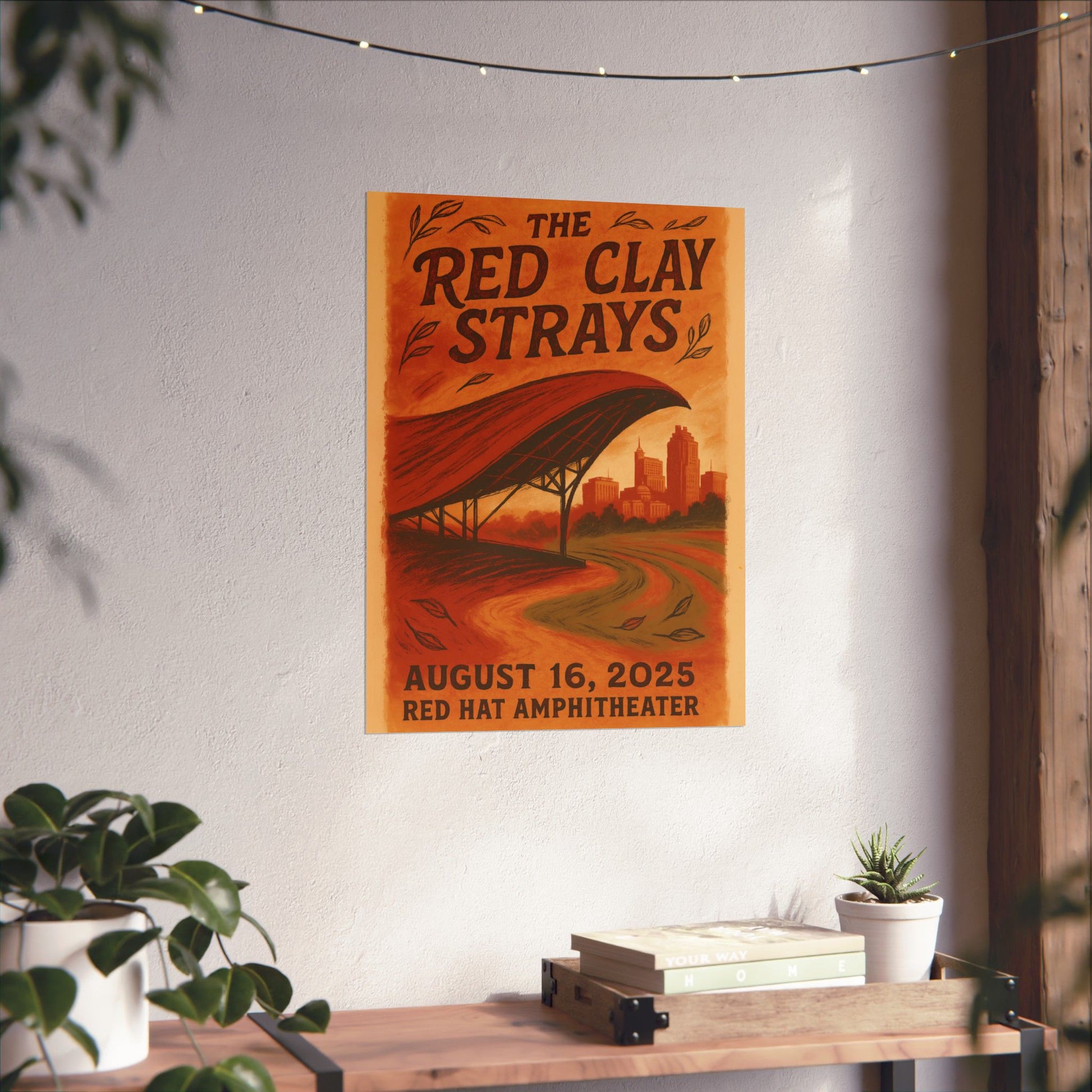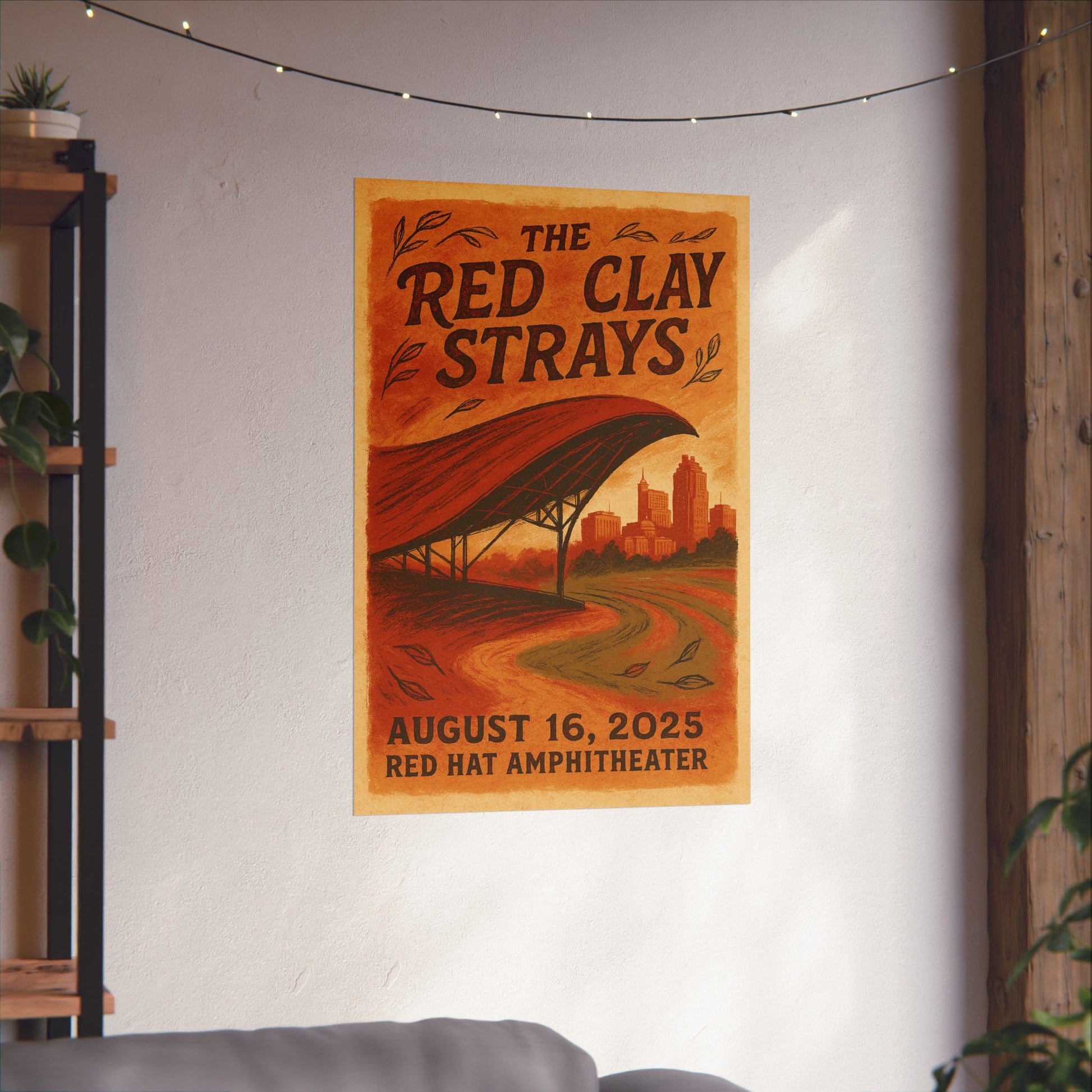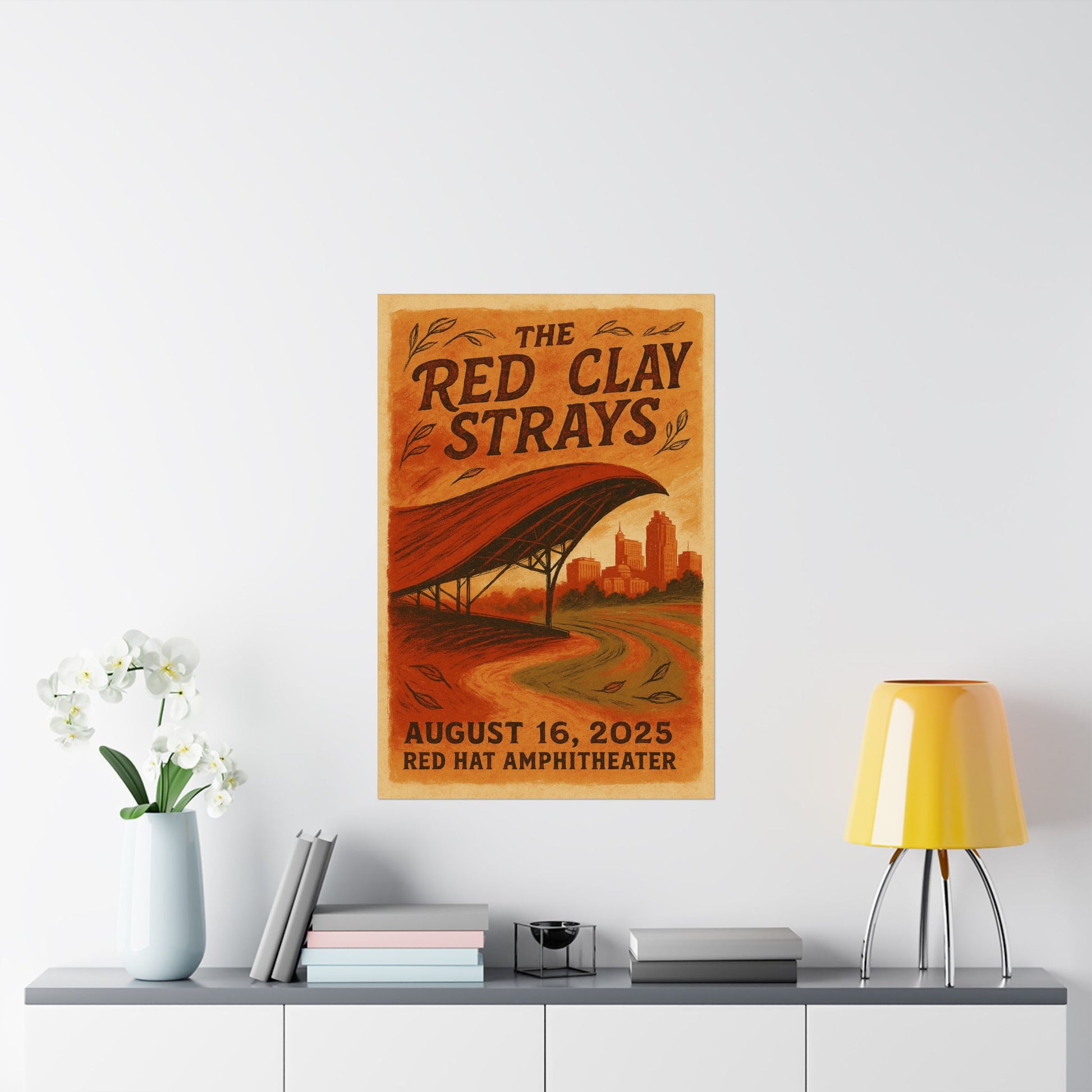 Drawing inspiration from the band's signature visual DNA, the print features rich, layered textures that evoke North Carolina's distinctive red clay soil. A stylized, hand-drawn depiction of the Red Hat Amphitheater's iconic sweeping red canopy dominates the midground, its curve echoed by the rustic, vintage typography of the band's name. In the background, a subtle silhouette of the Raleigh skyline, including notable landmarks, grounds the scene in its urban heart, all bathed in a warm palette of deep crimson, terracotta, and golden hues. This artwork perfectly blends the earthy, communal spirit of The Red Clay Strays with the unique architecture and cityscape of Raleigh.