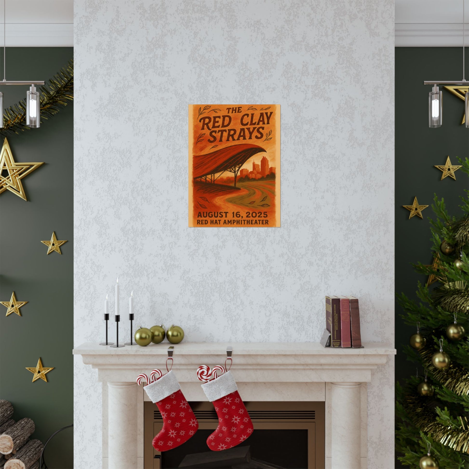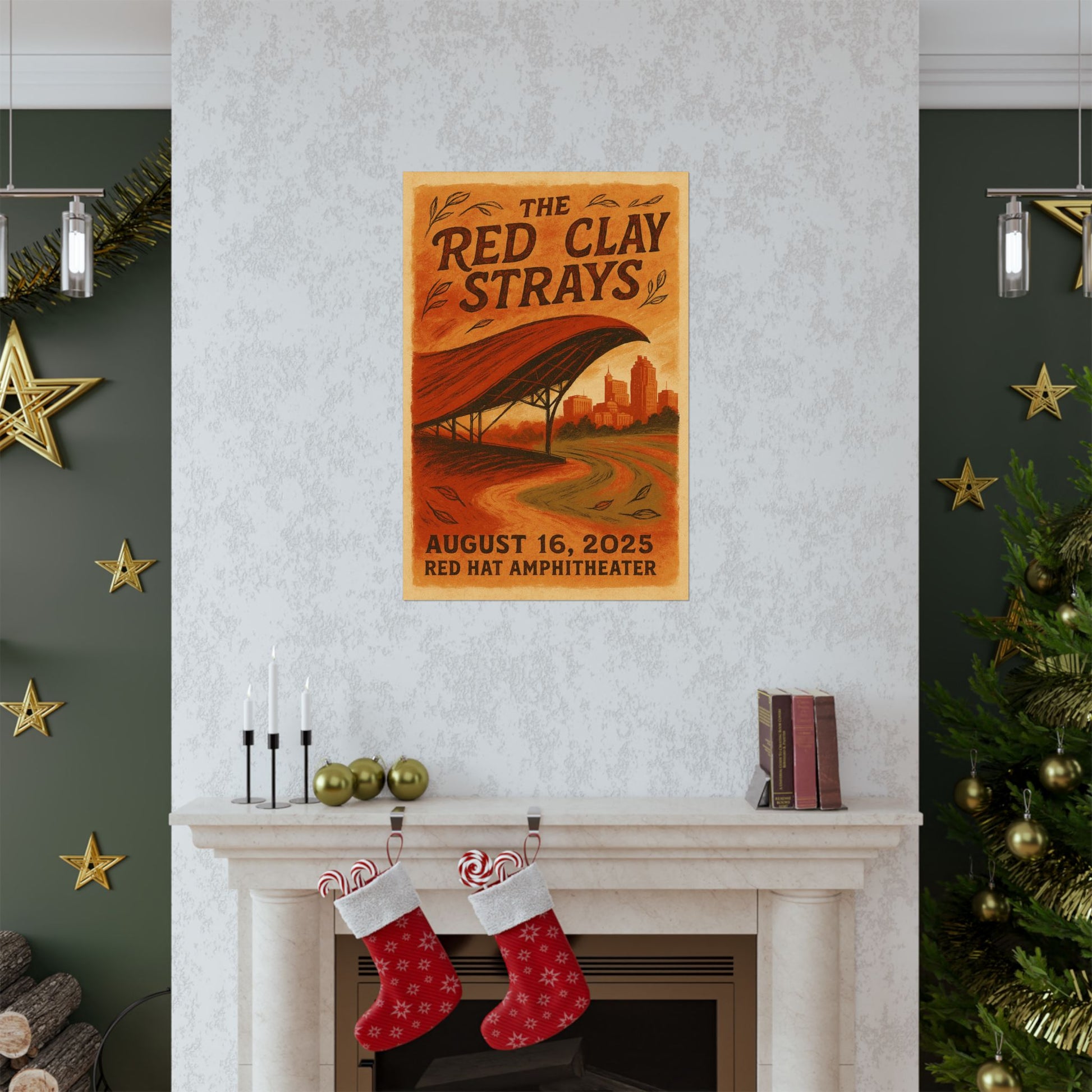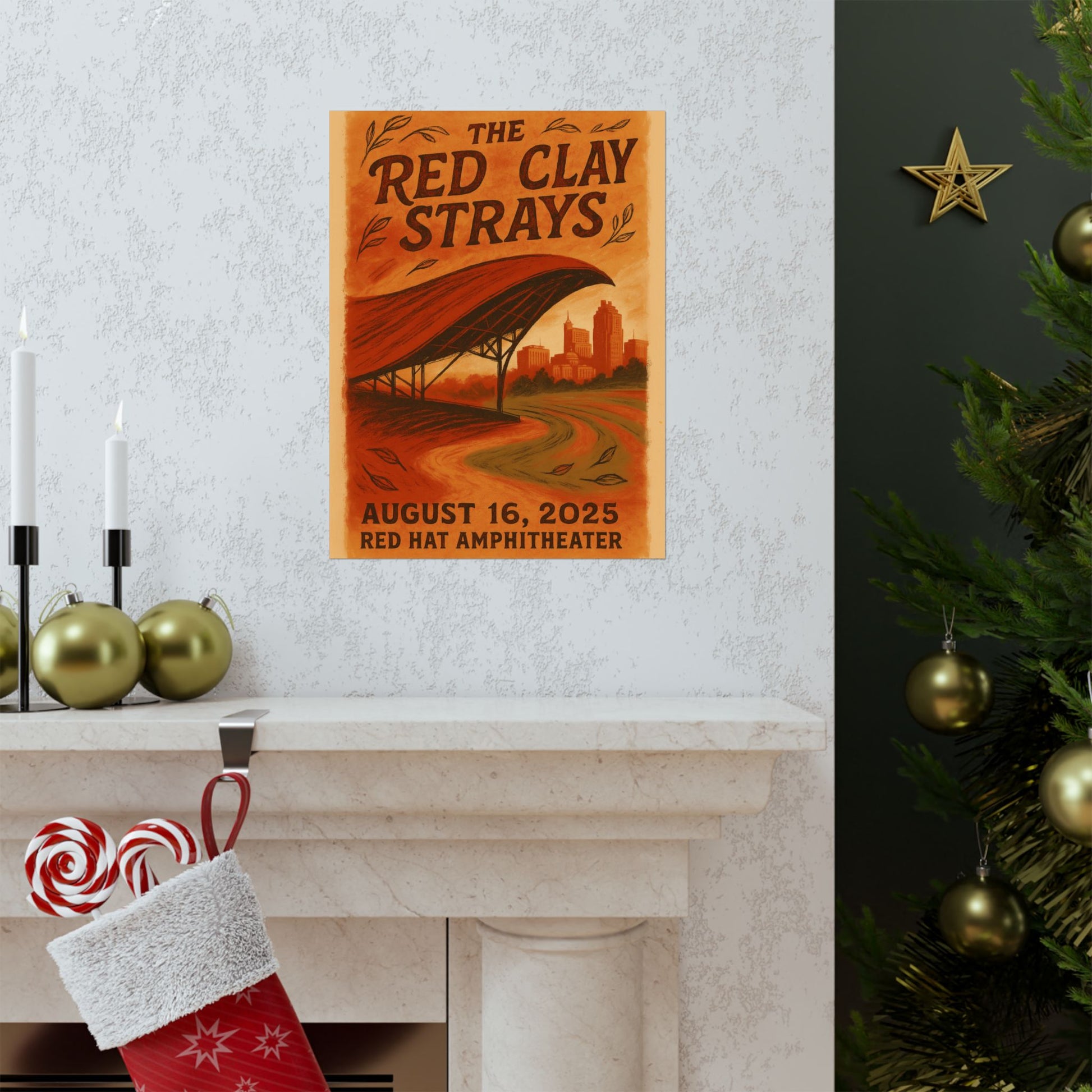 Drawing inspiration from the band's signature visual DNA, the print features rich, layered textures that evoke North Carolina's distinctive red clay soil. A stylized, hand-drawn depiction of the Red Hat Amphitheater's iconic sweeping red canopy dominates the midground, its curve echoed by the rustic, vintage typography of the band's name. In the background, a subtle silhouette of the Raleigh skyline, including notable landmarks, grounds the scene in its urban heart, all bathed in a warm palette of deep crimson, terracotta, and golden hues. This artwork perfectly blends the earthy, communal spirit of The Red Clay Strays with the unique architecture and cityscape of Raleigh.